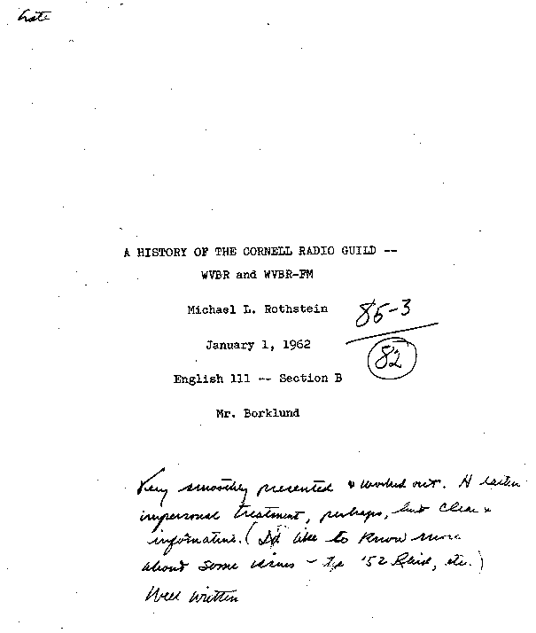 "Very smoothly presented & worked out. A rather impersonal treatment, perhaps, but clear and informative. (I'd like to know more about some issues - the '52 raid, etc.) Well written."We assume Mr. Borkland would have been more glad of the "impersonal treatment" had he attended a few C.R.G. meetings. We also feel constrained to point out that the mark of 82 is a fine one - Cornell was a tough grading school in those days - and, we guess, might reflect a small deduction for the notation in the upper left hand corner.